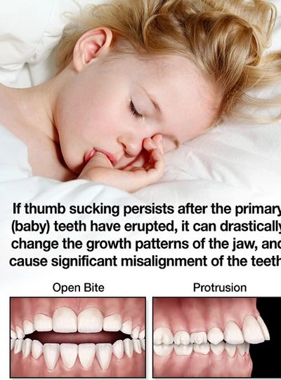 Thumb sucking that persists beyond the eruption of the permanent teeth can cause problems with the proper growth of the mouth and tooth alignment. How intensely and how long a child sucks on fingers or thumbs will determine whether or not dental problems may result. Children who rest their thumbs passively in their mouths are less likely to have difficulty than those who vigorously suck their thumbs.
